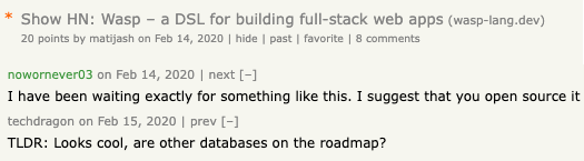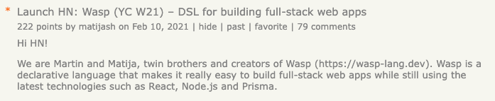We went through the several iterations of the text, sweated over how it’s gonna go, and when the day finally came — we launched! It went beyond all our expectations. With 222 points and 79 comments, our HN launch was one of the most successful launches (#9) out of 300+ companies in the W21 batch. Many developers and VCs that checked our launch afterwards were surprised how much positive feedback Wasp received, especially given how honest and direct HN audience can be.
