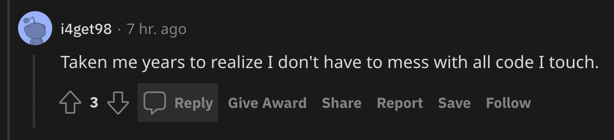 In the replies, there were also many developers who recognized another developer's desire "to fix things later" as a way to brush off criticism towards their work. They generally viewed this as a bad habit to get into, as it is often one that plagues developers even as they gain more experience. "Code reviews are not personal", and being able to take criticism graciously is an important skill to develop. After all, seniors are there to guide you towards making better decisions based on their own experiences. And juniors are there to learn.
