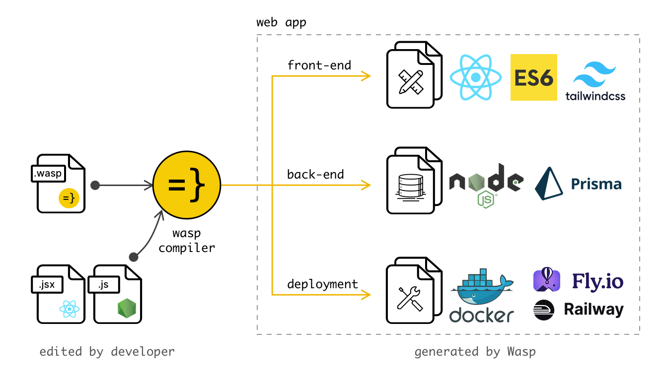 This combination of Wasp’s central config file, which acts as a set of instructions for the app, and compiler also allow Wasp to do a bunch of complex and interesting tasks for you via one-line commands, such as: